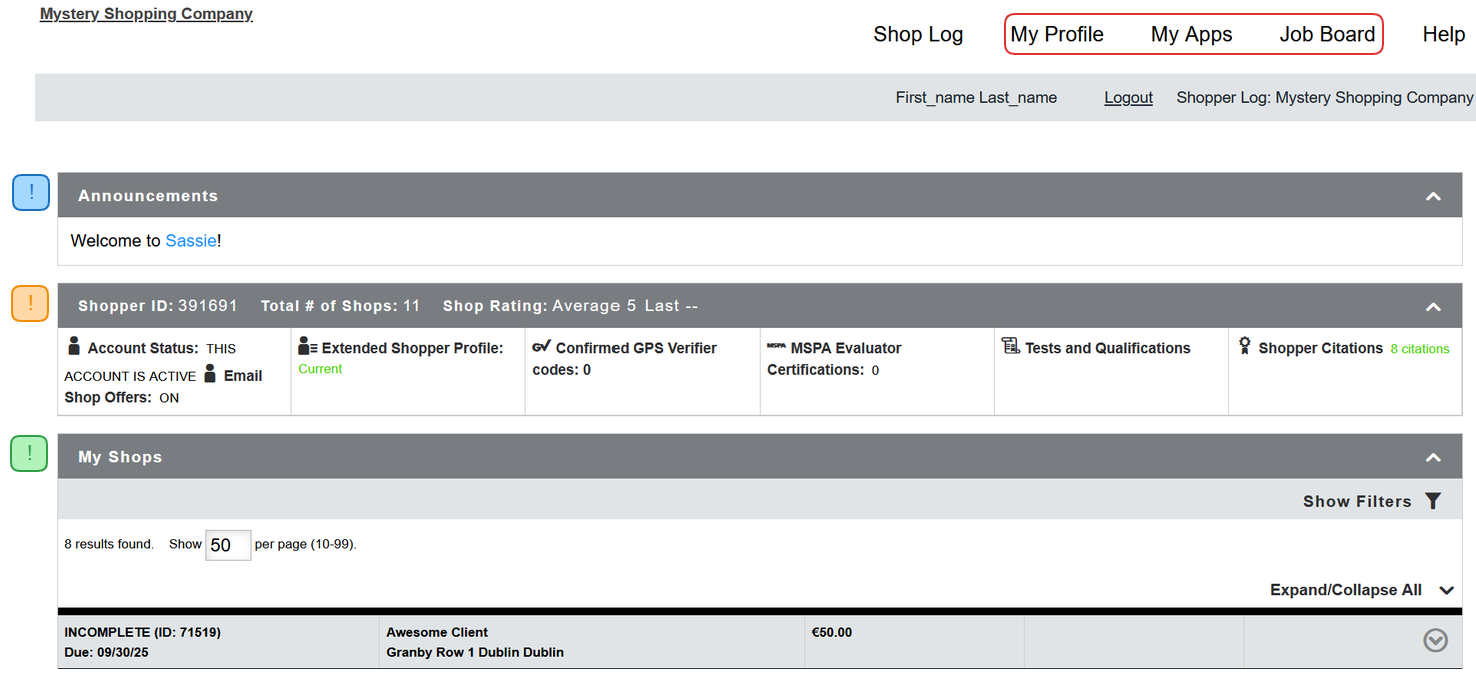 Below the shop status is the shop date information. Depending on the Mystery Shopping Company, you might or might not be able to select, or update some of the dates.