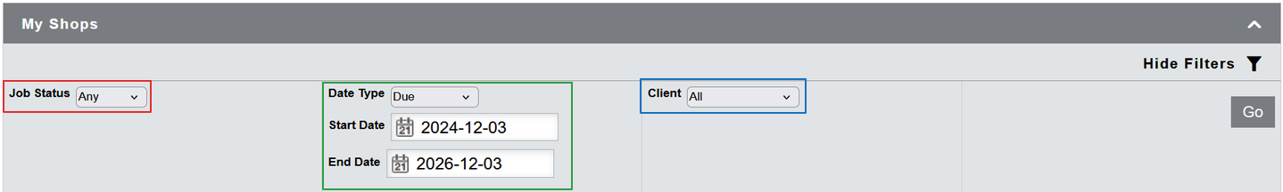 You can filter your shops by job status, the dates, or per client the shop belonged to. Simply make your selection and use the GO button on the right.